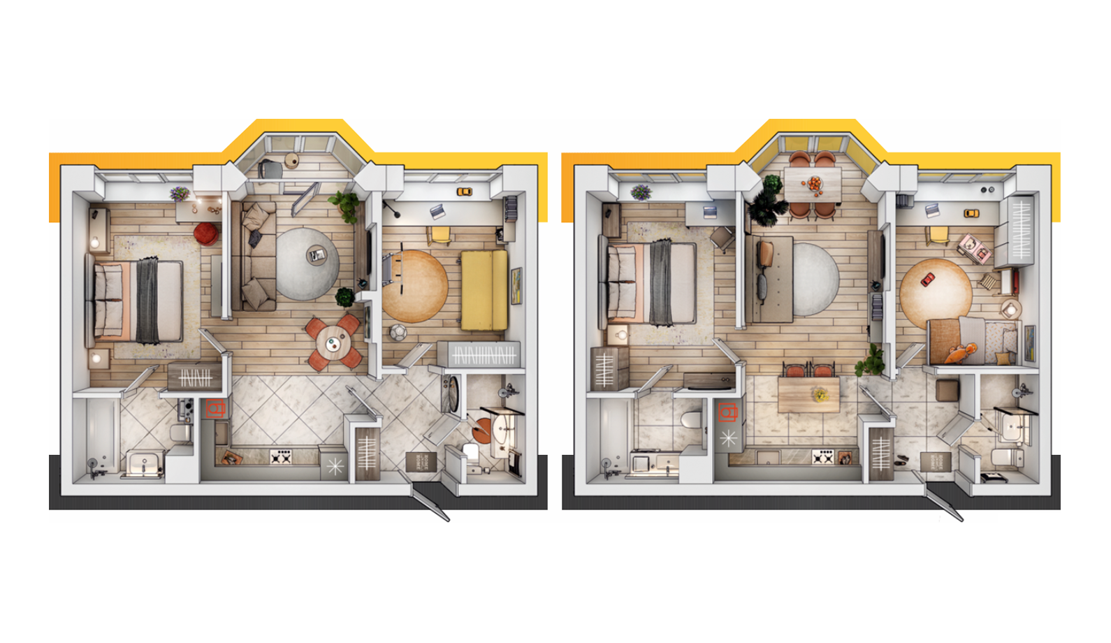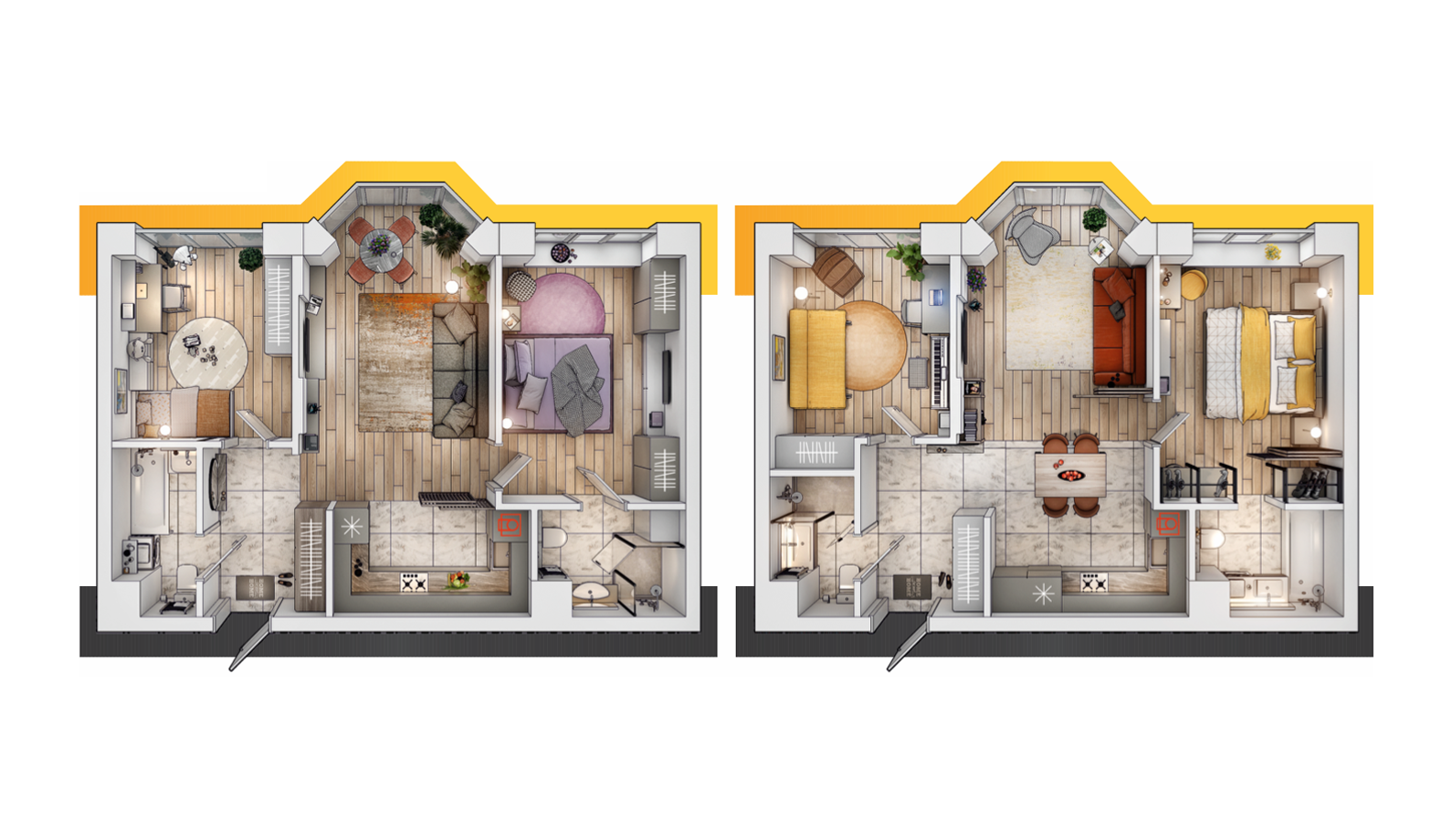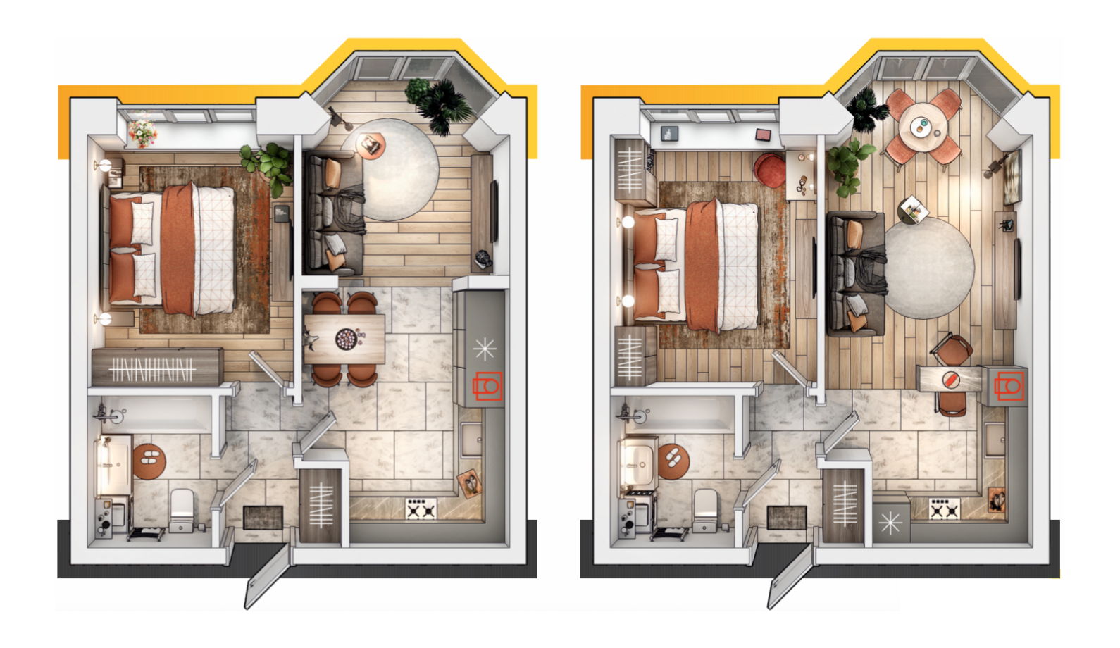 В такій квартирі фактично відсутній коридор, який зазвичай є найменш використовуваним приміщенням в квартирі і з'їдає 10-15% площі.